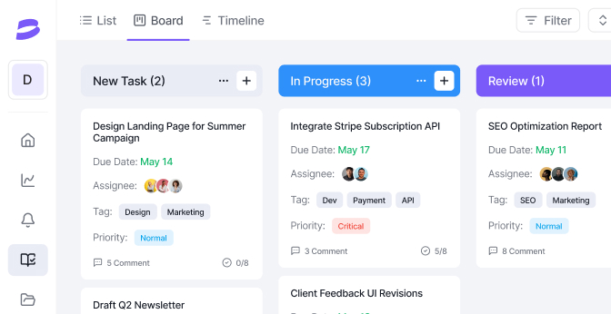 Assign, prioritize, and track tasks with clarity. Stay focused with real-time updates, custom statuses, and visual boards.